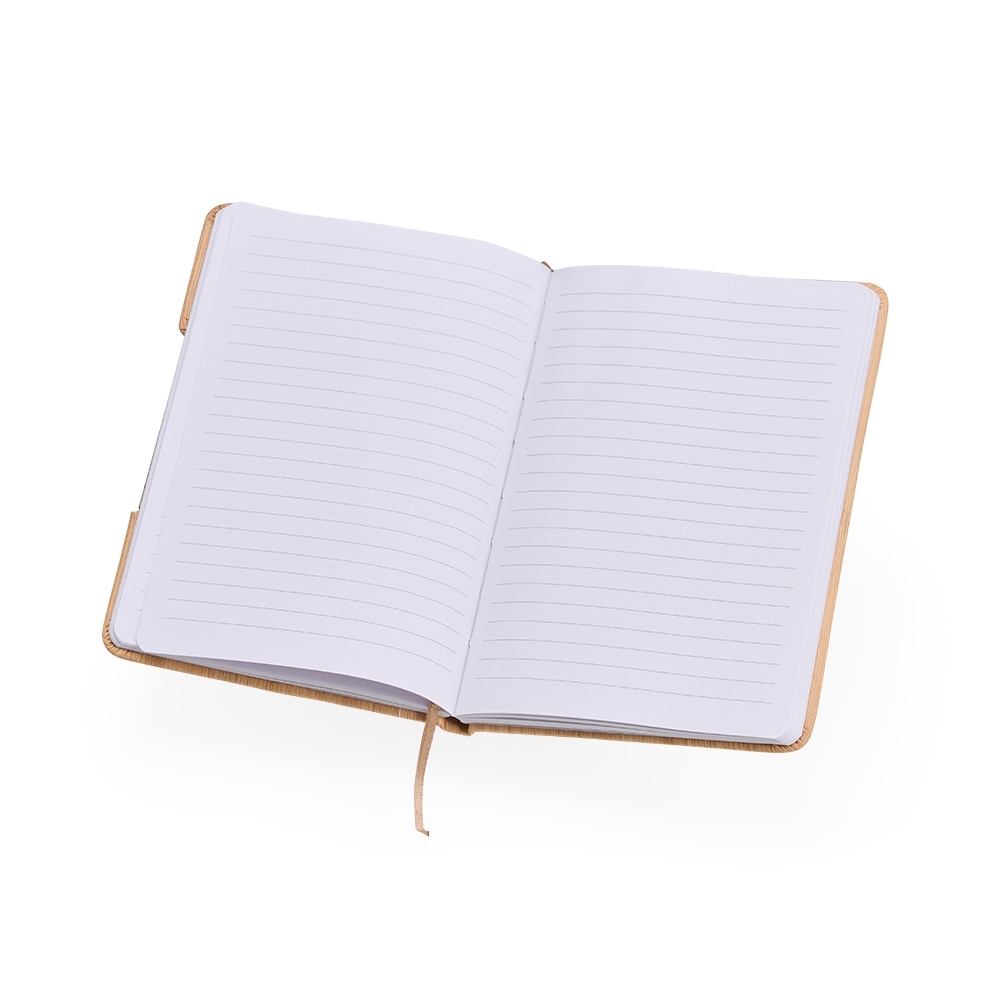 • Descrição: Caderneta feita em plástico, sua capa se assemelha ao bambu. Com marcador de cetim, 80 páginas brancas pautadas e suporte para celular embutido na capa.