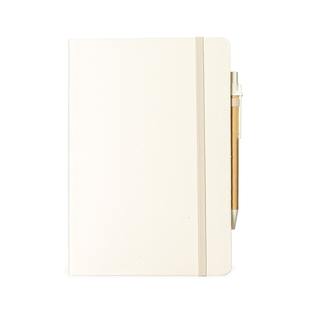 • Descrição: Caderneta ecológica com capa em fibra da palha de arroz. Contém aproximadamente 80 folhas amareladas com pauta, além de duas folhas de guarda, uma fita elástica para fechamento e porta canetas em elástico. Acompanha uma caneta esferográfica de carga azul de 1,0mm com corpo em papelão e clip, acionamento por clique e ponteira em plástico.