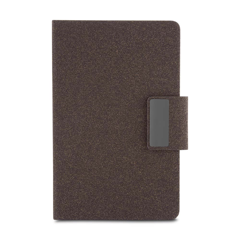 • Descrição: Caderno de anotações com capa em PU e fibra de chá ou café, 80 folhas 70 g/m², engate para caneta com fechamento magnético e placa de metal, não acompanha caneta.