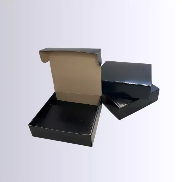 • Descrição: Caixa em papelão microondulado com parte externa em papel cartão preto