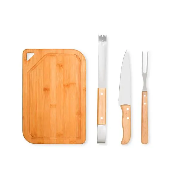 • Descrição: Kit para Churrasco composto por tábua em Bambu; faca 7″, garfo trinchante e pegador em Madeira/Inox. Como cortesia, na faca 7″ fazemos uma gravação com os cortes do boi.