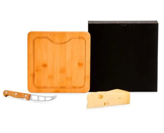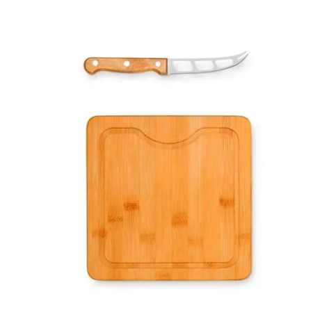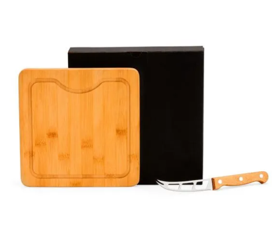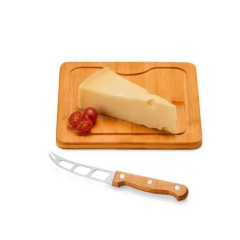 • Descrição: Kit para Queijo. Composto por tábua quadrada em Bambu e faca 4″ para queijo com cabo em Madeira/Inox. Tábua confeccionada com tripla camada invertida, para dar maior durabilidade e não deformar com o passar do tempo.