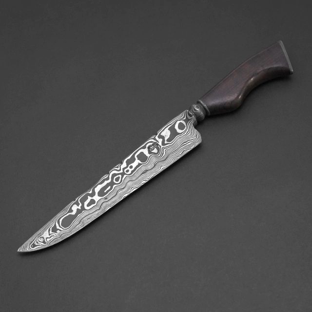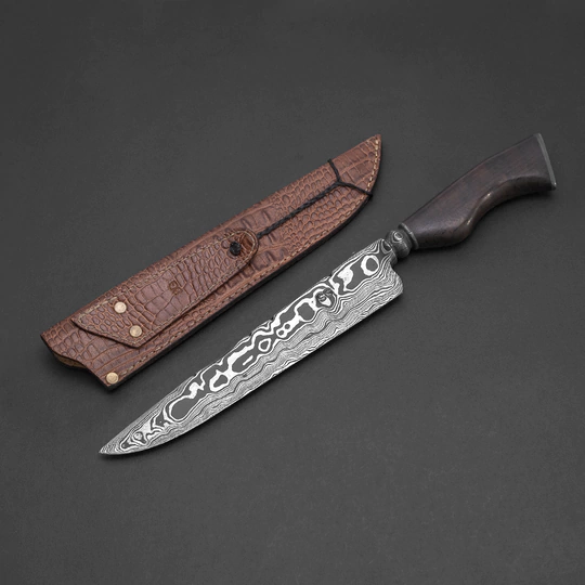 • Descrição: Uma peça que une tradição e tecnologia, a Faca Damasco Aleatório Ponta Larga é ideal para colecionadores e chefs que buscam performance e exclusividade. Com lâmina robusta de 5 mm feita com mais de 360 camadas dos aços 15N20 e 1070, ela oferece durabilidade, equilíbrio e padrões únicos de Damasco que tornam cada peça singular. Lâmina em Aço Damasco forjado com 15N20 e 1070, mais de 360 camadas com 5mm de espessura e 9” (23 cm). Alta retenção de fio e resistência (≈ 62–64 HRC). Cabo em Madeira jacarandá, ergonômico, resistente e sofisticado, aproximadamente 13 cm. Desenhos únicos e naturais da lâmina Damasco. Bainha em Couro legítimo artesanal para proteção e transporte. Produção artesanal nacional.