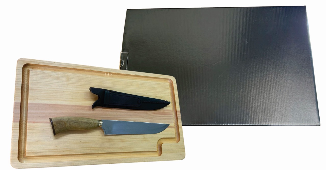 • Descrição: Kit composto por tábua de madeira maciça teka sem emendas e faca de 8 polegadas em aço cirúrgico com bainha em couro legítimo. Fornecido em caixa preta