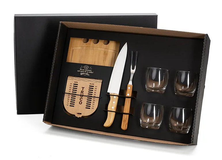 • Descrição: Conjunto para Churrasco / Whisky / Truco. Acompanha tábua com três furos em Bambu; faca 8\’\’ e garfo em Bambu/Inox; quatro copos de whisky em Vidro; caixa para truco com marcador de tentos e jogos em MDF; jogo de cartas. Como cortesia, na faca 8\” fazemos uma gravação com os cortes do boi.