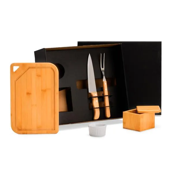 • Descrição: Composto por tábua em Bambu; faca 7″ e garfo em Madeira/Inox; saleiro em Bambu e ramekin em porcelana.