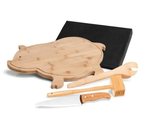 • Descrição: Kit para Cozinha em Bambu/Aço Inox; Conta com tábua em formato de porco, pegador 22cm e martelo em Bambu; Faca 7” em Bambu/Inox. Tábua confeccionada com tripla camada invertida, para dar maior durabilidade.