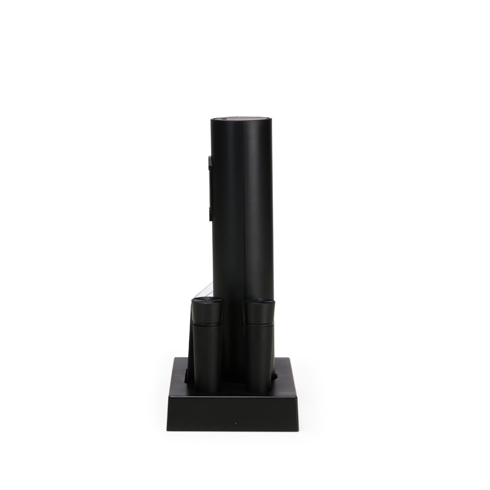 • Descrição: Kit vinho com seis peças, incluindo saca-rolhas recarregável com acionamento por botões, bico dosador, duas rolhas plásticas, cortador de lacre e base organizadora. Acompanha cabo USB-C.