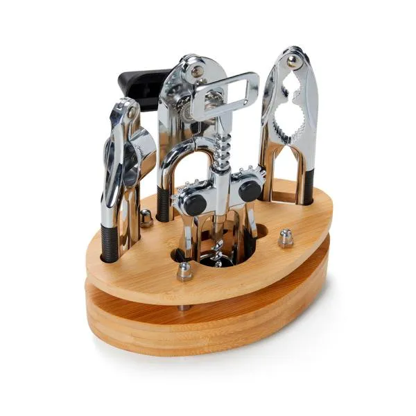 • Descrição: Kit com quatro acessórios úteis para cozinha em metal cromado brilhante com detalhes em plástico texturizado preto nos cabos, sendo um abridor de latas borboleta, um espremedor de alhos, um alicate quebra-nozes, um saca-rolhas de alavanca dupla com espiral e taças de 490 ml para vinho.