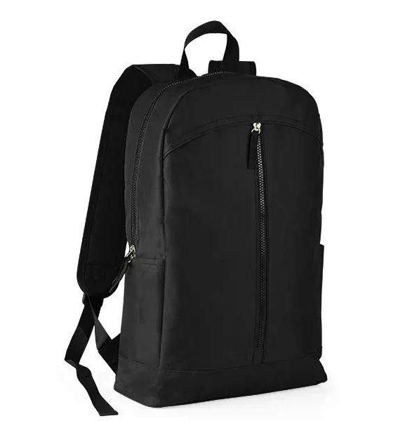 Descrição: Mochila preta confeccionada em Polyester 600D. Conta com bolso principal com zíper duplo cursor, bolso frontal em zíper diagonal, dois bolsos laterais, divisória para notebook, alças ajustáveis e alça de mão