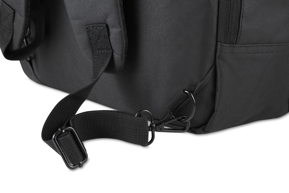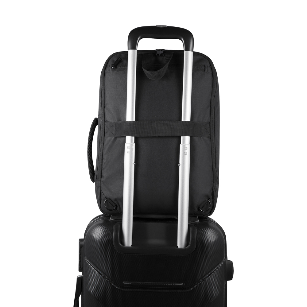• Descrição: Mochila/pasta em poliéster 300D com detalhe em PU e interior em poliéster 210D. Possui alças lateral e de ombro acolchoadas, alça de mão, engate para mala de viagem, bolso frontal com zíper, compartimento interno para notebook até 15,6” e bolso traseiro para ocultar as alças.