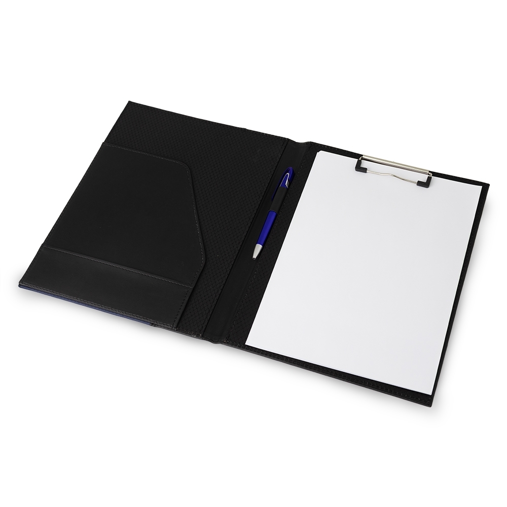 • Descrição: Pasta convenção de couro sintético, possui porta caneta, dois compartimentos, sendo um para arquivar documentos e um bloco com aproximadamente 15 folhas brancas não pautadas. (NÃO ACOMPANHA CANETA)