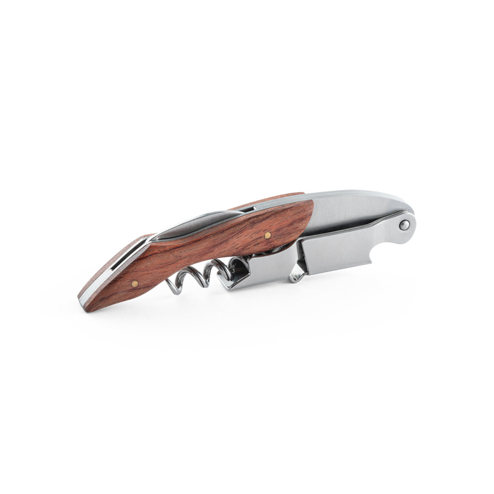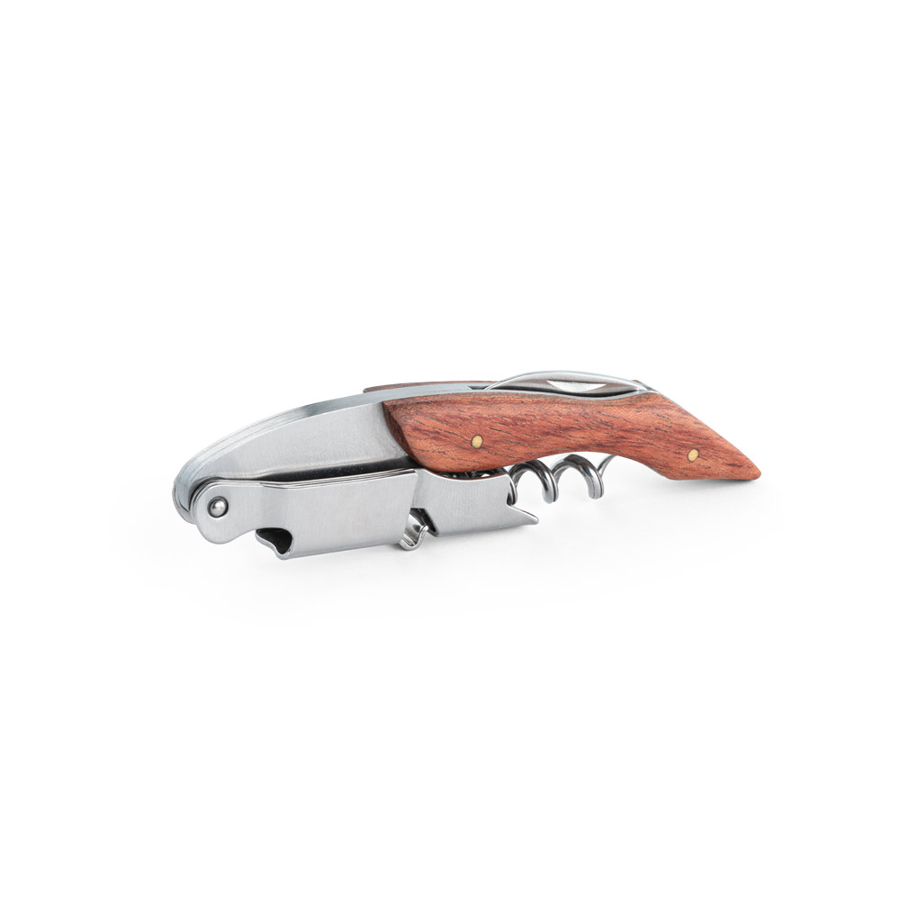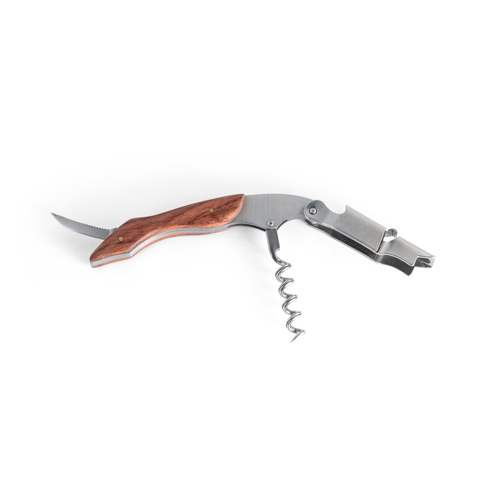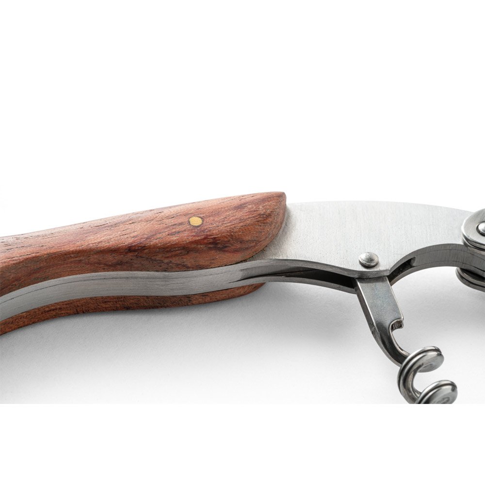 • Descrição: Saca rolhas em madeira e aço inox. Com sistema de mola para extração em duas fases. Com canivete de escanção.